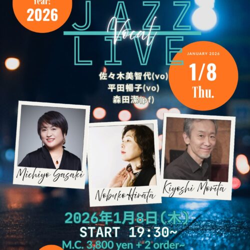 8 Thu 2026 2026年1月8日 (木) 赤坂Keiライブ with 平田暢子vo、森田 潔pf LIVE 2026年1月8日 (木) 赤坂Keiライブ with 平田暢子vo、森田 潔pf 年明け1/8 (木)、赤坂Keiに出演します。共演ヴォーカリストは、映画を制作したり、オリジナル曲も… MORE DETAIL
