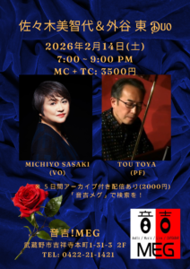 2/14 (土) 音吉! Meg@吉祥寺 with 外谷 東 pf <配信あり> 2月 14 Sat 2026 LIVE 2/14 (土) 音吉! Meg@吉祥寺で外谷 東さんとのデュオです。 ただいま新曲を鋭意仕込み中。懐かしい日本語の歌も、「そこ来たか」的な曲を用意しています。お楽しみに 5日間有効アーカイブ付き配信(2000円)もあります♪ https://otokichi-meg.net/events/2026-02-14-1 ハイクオリティな配信を全国、いや全世界の皆様にご視聴頂ける絶好の機会です。特にピアノの歌伴を勉強中の方にはオススメ お店にご来場くださった方にも、配信リンクが進呈されます。 ご予約は上記ホームページから、または出演者まで。 前のスケジュール