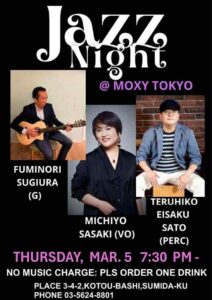 3/5 (木)19:30~ moxyzライブ@モクシー東京錦糸町ロビーラウンジ 3月 5 Thu 2026 LIVE 3/5 (木)の夜は、久々のmoxyzライブ@モクシー東京錦糸町ロビーラウンジ、19:30からです。 ワンドリンク注文して頂ければノーチャージでお楽しみになれますが、投げ銭頂ければ幸いです♪ moxyz (杉浦史典 gt、佐藤”えいさく”輝彦 perc、佐々木美智代 vo) 前のスケジュール