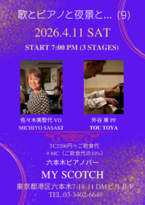 4/11 (土) 7:00 pm~ 六本木マイスコッチ 4月 11 Sat 2026 LIVE 4月のライブの告知を 大好きな六本木のピアノバーMy Scotchで外谷さんとデュオライブです。 https://myscotch.tokyo/ 前のスケジュール