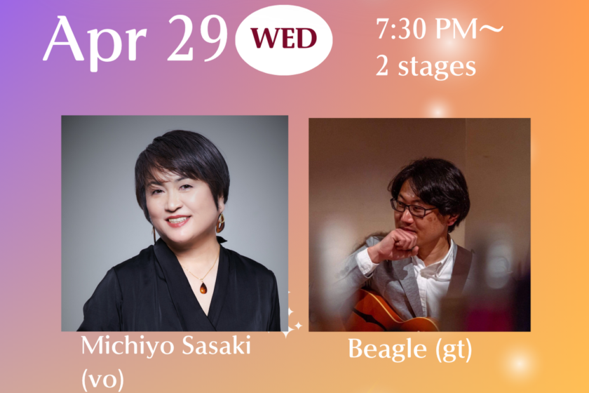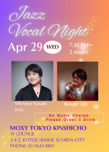 4/29 (水祝) 7:30pm~ モクシ―東京錦糸町ロビーラウンジでビーグル(gt)さんと2回目の共演です。